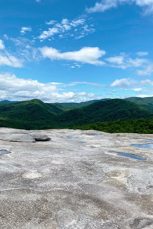We trek uphill over protruding roots and wooden log staircases. The rocky trail leads to the Wolf Rock summit for a breathtaking view of the Blue Ridge escarpment where the ridges divide three watersheds – Garden Creek, Widow’s Creek, and Bullhead Creek. Take a pause on the rocky surface where the wind roars and the blue mountain tops and rolling green hills extend for miles.